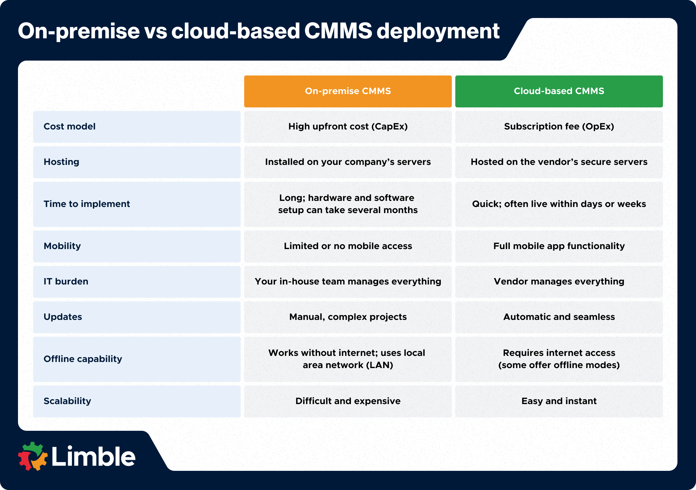 To summarize everything we said so far, here’s a side-by-side comparison of the on-premise and cloud CMMS deployment models: