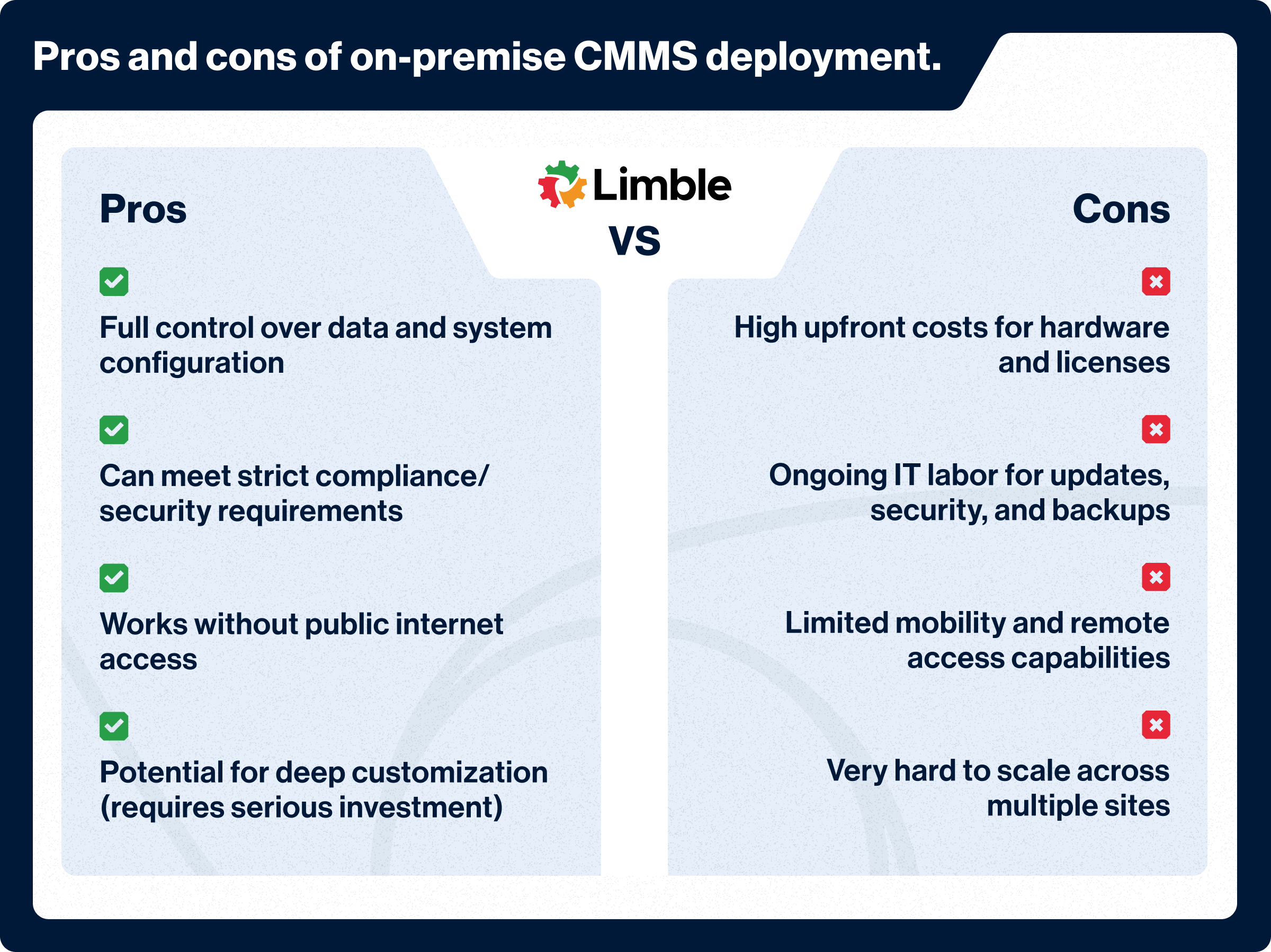 Before we move on, here is a quick look at the pros and cons of the on-premise CMMS deployment: